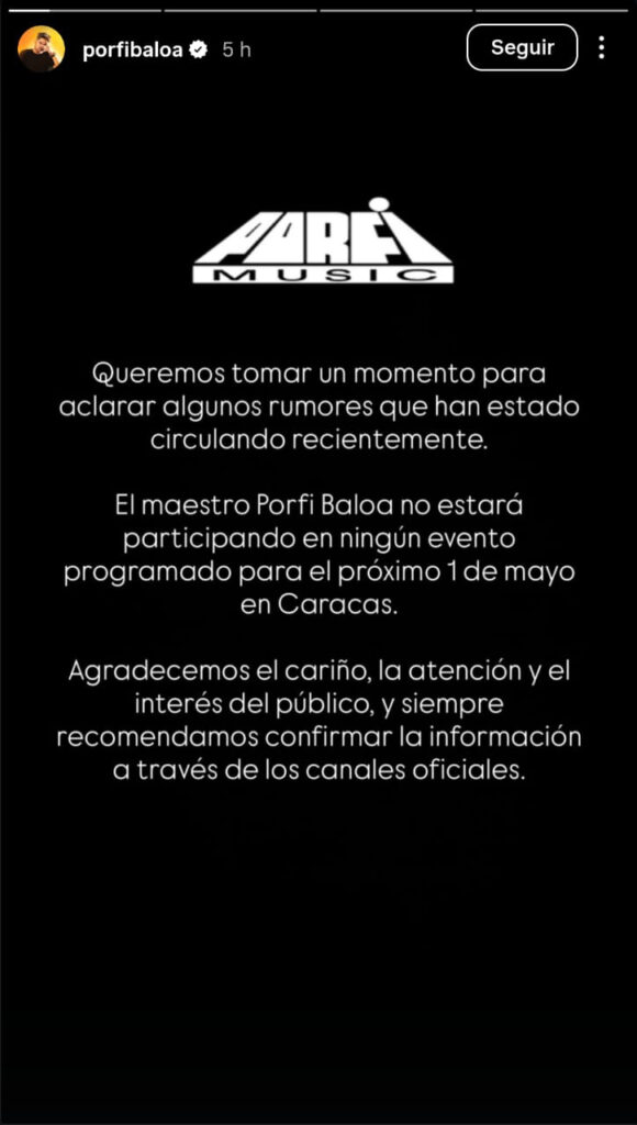 «Queremos tomar un momento para aclarar algunos rumores que han estado circulando recientemente. El maestro Porfi Baloa no estará participando en ningún evento programado para el próximo 1 de mayo en Caracas», apuntó una historia subida por el músico en su cuenta de Instagram.