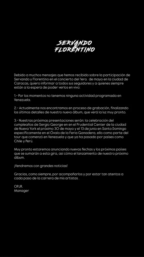 De igual forma, Ponte Jr. señaló que las próximas presentaciones de Servando y Florentino serán el 30 de mayo para celebrar el cumpleaños de Sergio George en Nueva York y el 13 de junio, cuando estarán en concierto en Santo Domingo, República Dominicana, específicamente en el Óvalo de la Feria Ganadera.